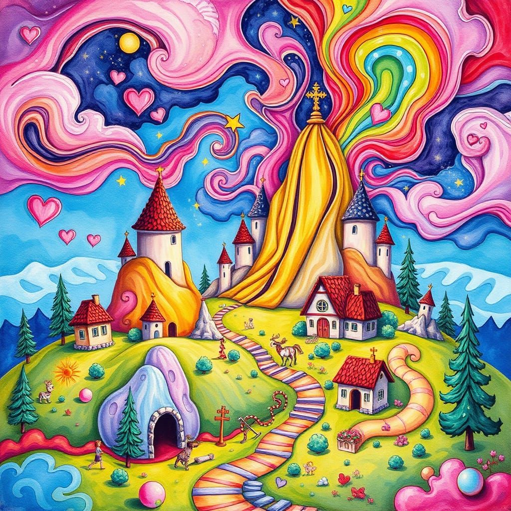 This image shows a vibrant, colorful Candyland wonderland mountain scene. The artwork features gouache swirls and intricate details, creating a whimsical and visually appealing landscape.