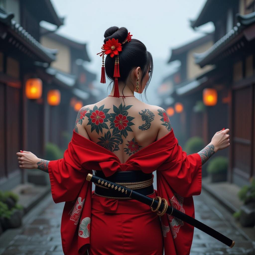 This image shows a ninja or geisha in a red kimono, revealing intricate tattoos. The setting is a misty, traditional Japanese village street in soft, diffused light.