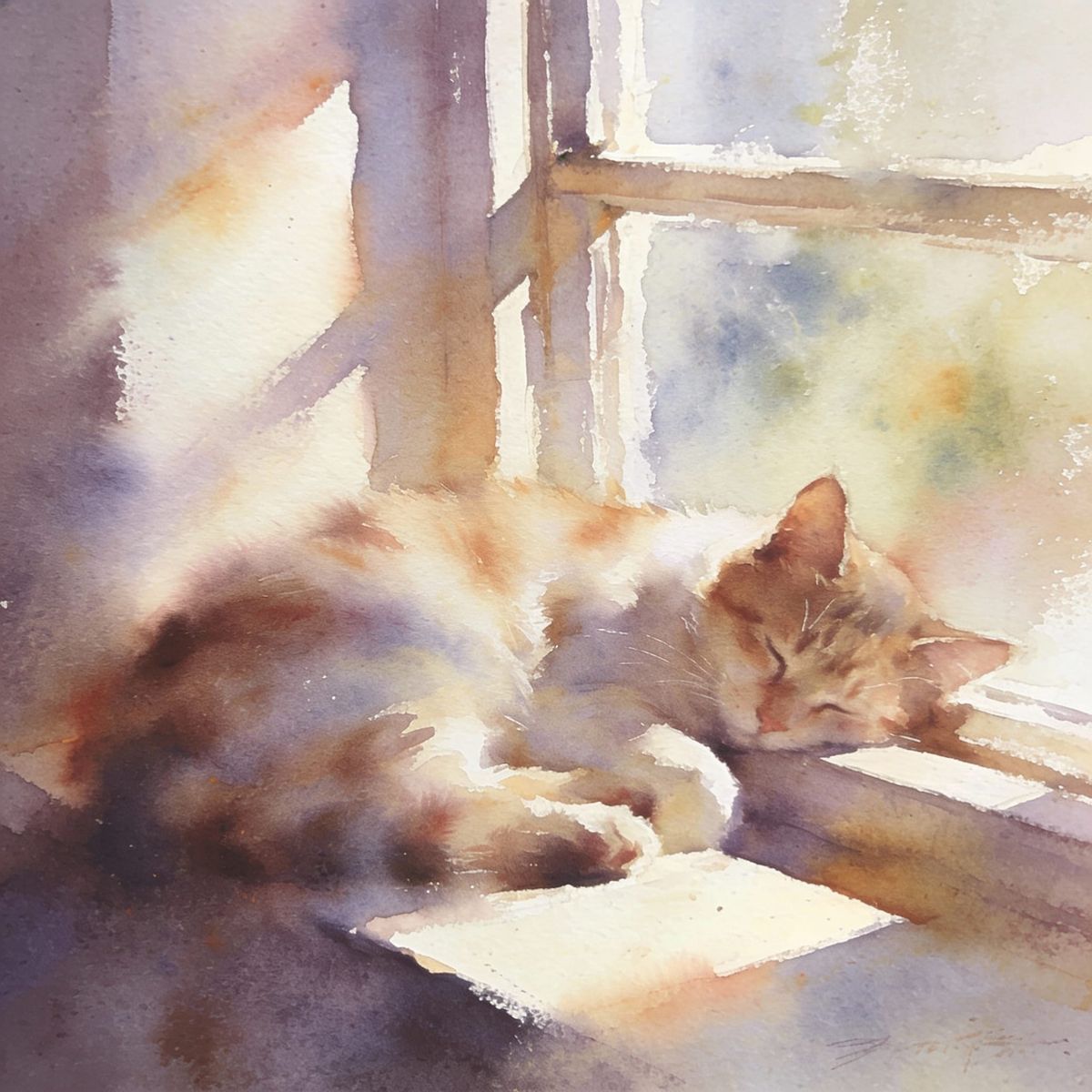 A tranquil watercolor painting captures a cat napping on a sunlit windowsill. Soft washes of color and blurred edges create a dreamy, peaceful atmosphere.