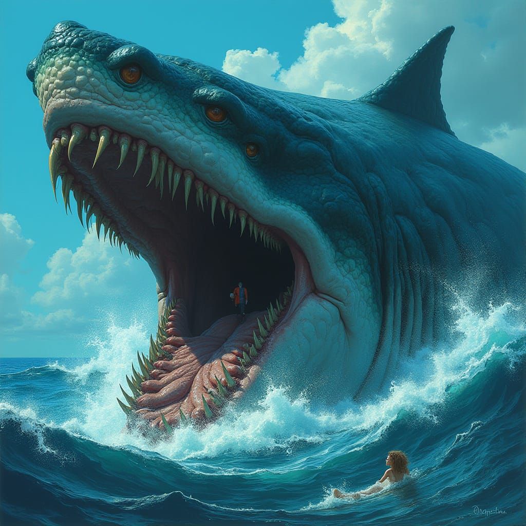 This image depicts a massive sperm whale with a massive mouth full of sharp, yellowed teeth, surrounded by turbulent waves, swallowing a diver in a blue-green wetsuit. The vibrant blue and green hues of the ocean are reminiscent of fantasy art, with intricate details and organic textures.