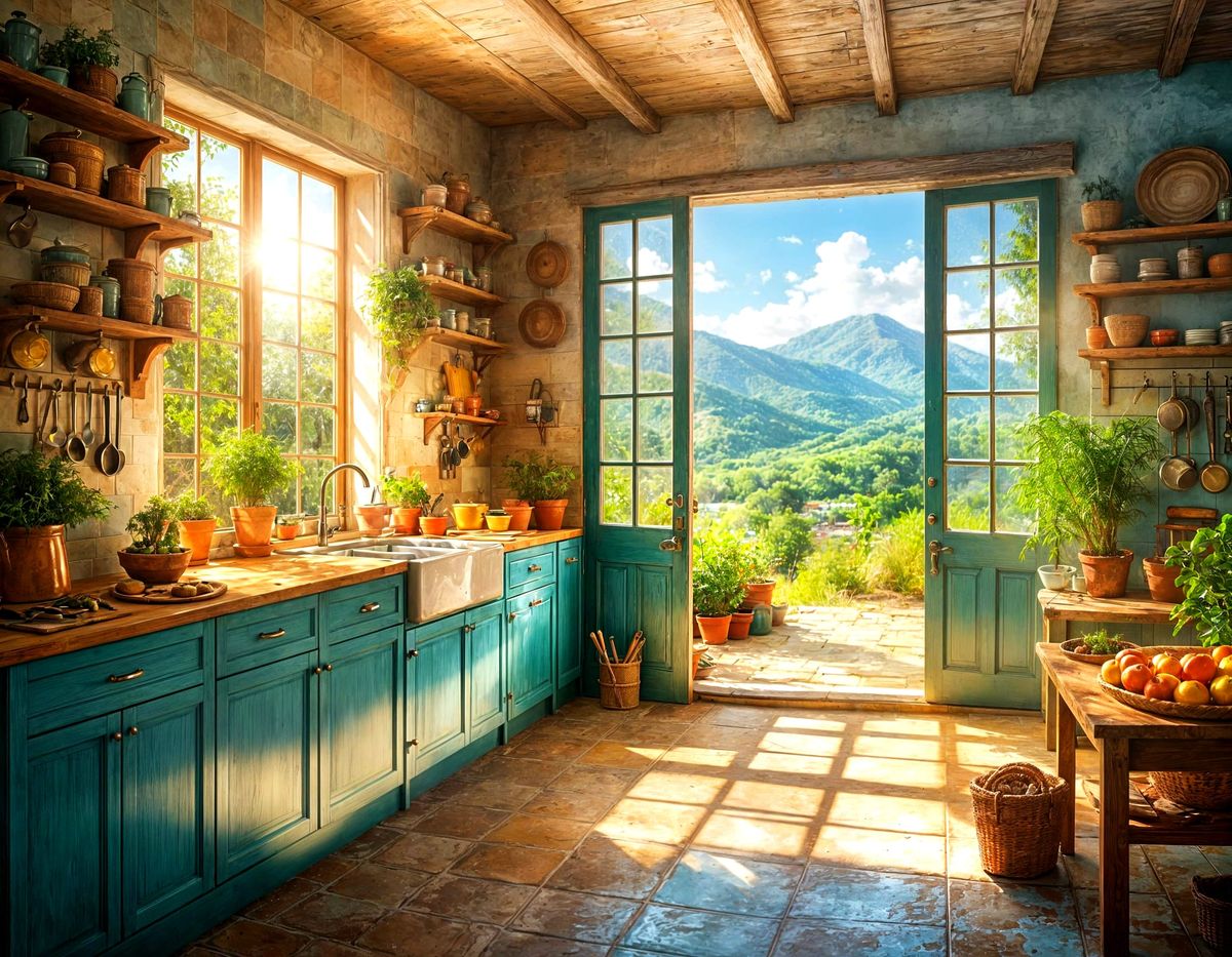 This AI-generated image depicts a serene, rustic kitchen bathed in golden sunlight. Cinematic close-up view with turquoise cabinets, terracotta floors, and a hint of bokeh in the background.