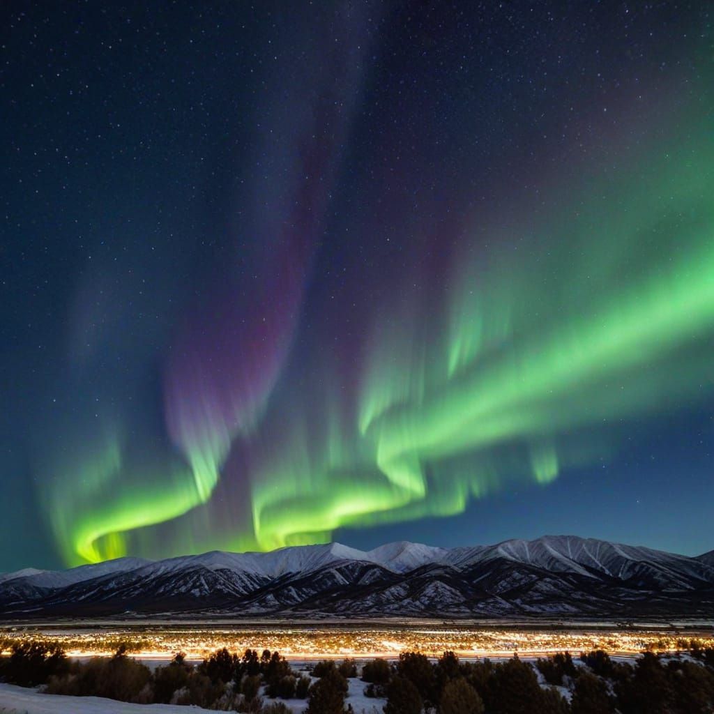 A vibrant image of the aurora borealis dancing above Salida, Colorado. The breathtaking natural phenomenon illuminates the night sky with shimmering green and purple hues.