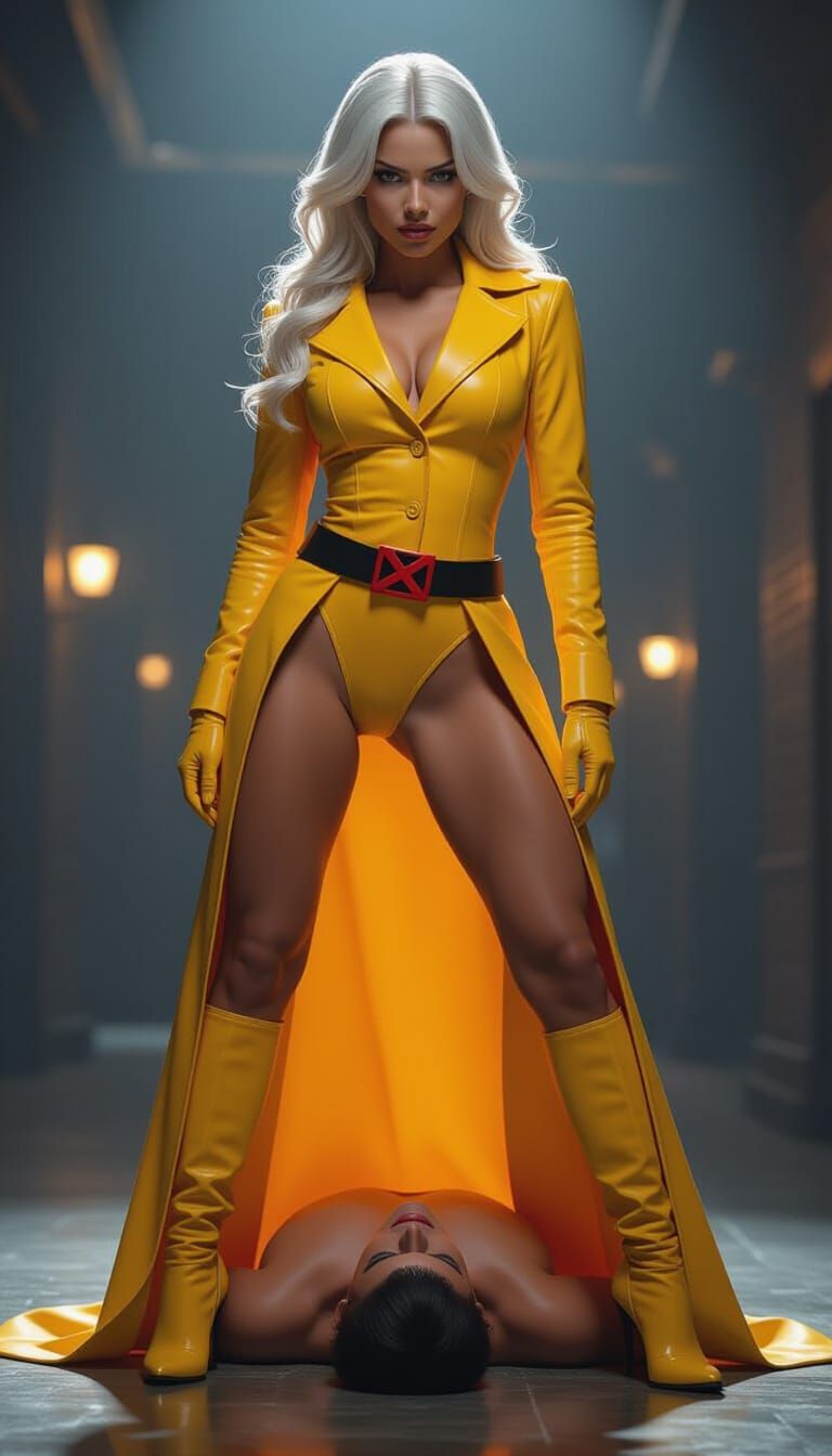 This ultra-realistic image shows Storm from X-Men standing on a man's chest. Features cinematic lighting, dramatic shadows, and hyper-detailed textures for a photorealistic rendering.