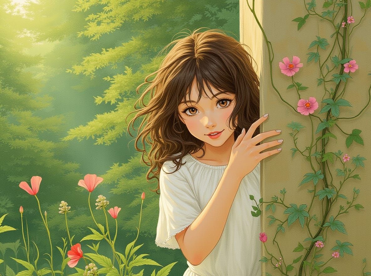This image shows a beautiful girl in a white dress with long hair, peeking around a wall with vines and flowers. Rendered in a bold watercolor style with muted colors and dramatic lighting.