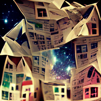 This image shows a whimsical scene of paper houses reaching for the stars. The fragile structures evoke a sense of dreams and aspirations in a surreal landscape.