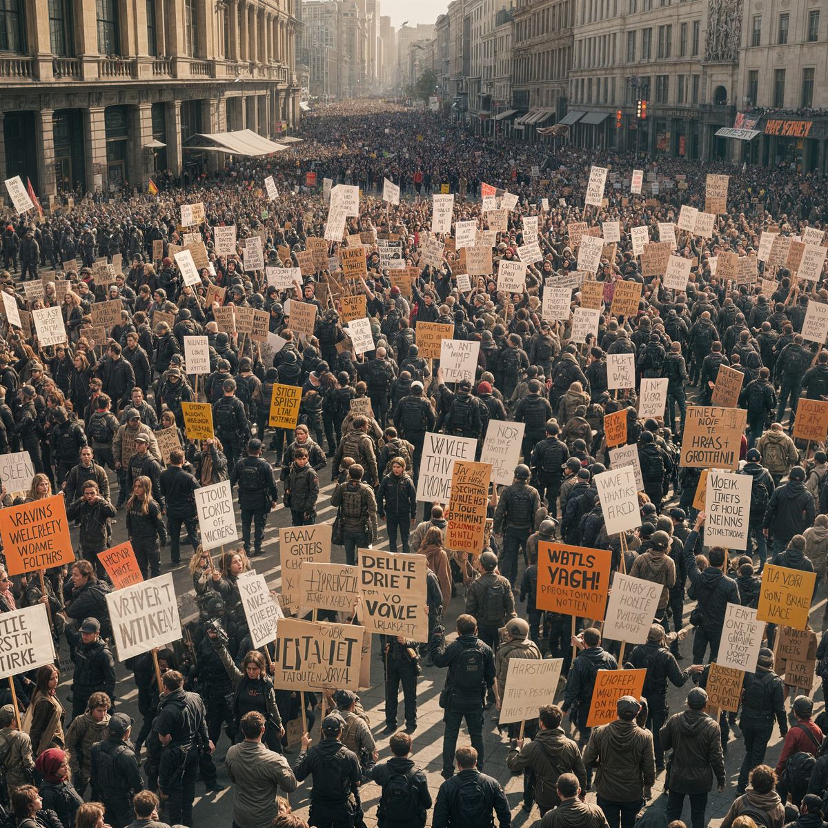 This image shows protestors defying gravity during a strike. The scene is captured with cinematic lighting and post-processing, resembling a still from a high-quality live-action film.