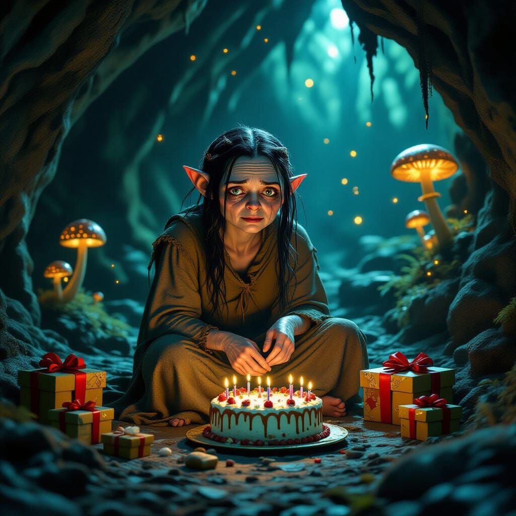 This image shows Gollum's wife alone in a mystical cave filled with glowing mushrooms, crying beside her birthday cake. This fantasy concept art features rich, deep colors and intricate details, rendered as a matte painting.