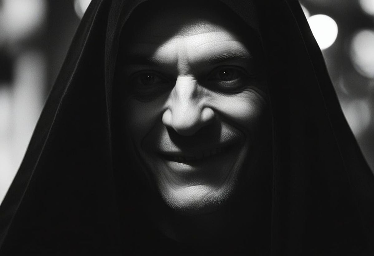 A close-up portrait of a master manipulator villain, exuding malevolence with an empty gaze and mirthless smile, set against a dark, dimly lit background with ominous shadows and a faint, eerie glow.