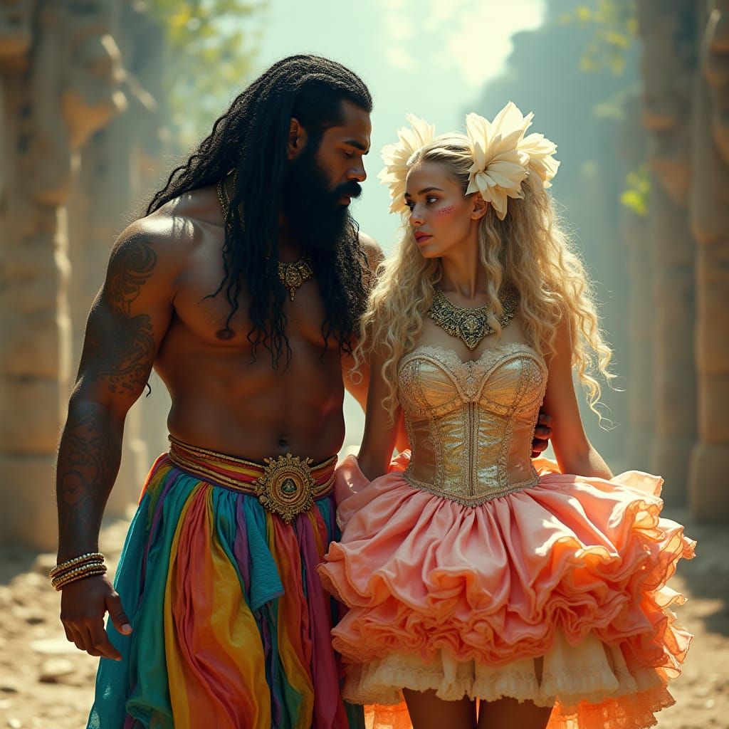 This image depicts a powerful tribal king and his delicate bride, set against a cinematic backdrop reminiscent of a 35mm film. The king's rugged features and athletic build are a striking contrast to his bride's fragile appearance, adorned in an extravagant, rainbow-hued satin dress and towering pigtails...