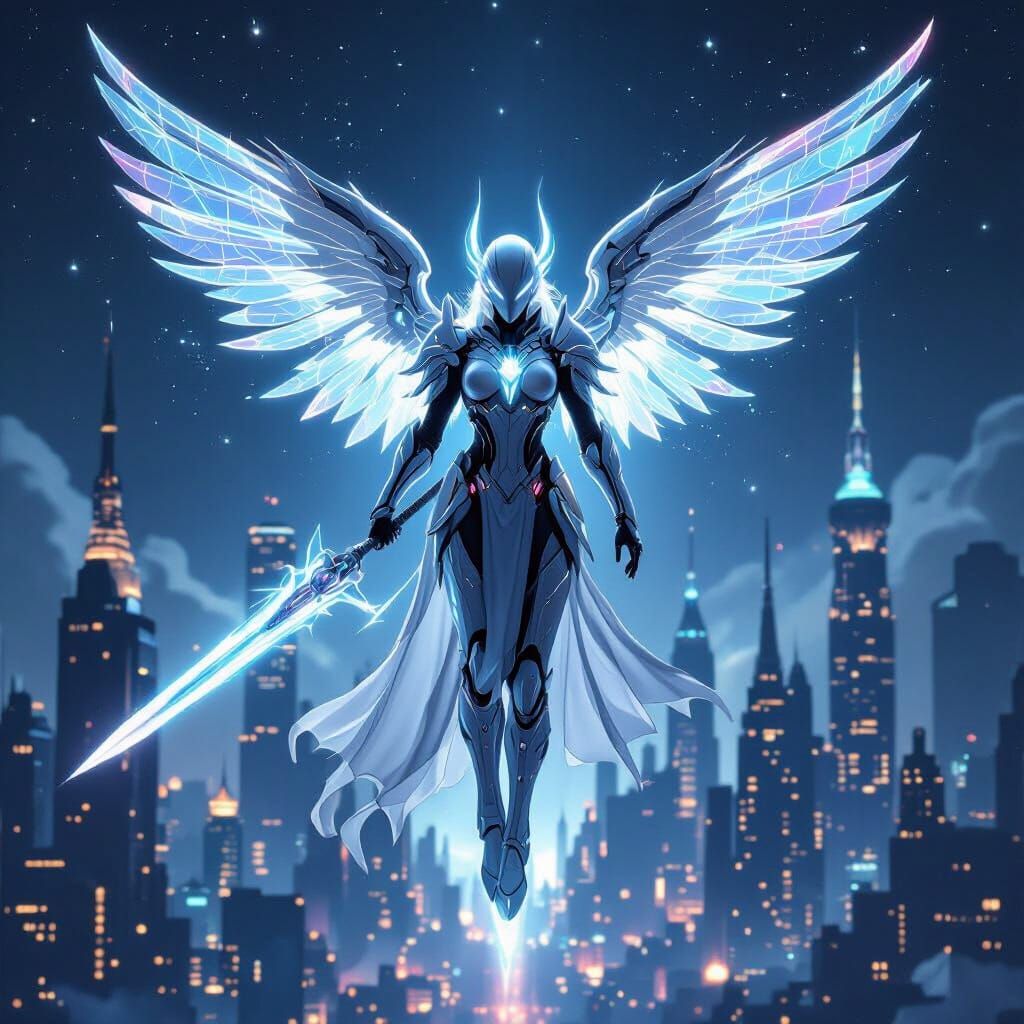 This image depicts a celestial guardian angel in sleek, futuristic armor, floating above a luminous city. The angel possesses radiant energy wings and a glowing spear, embodying peace and power.
