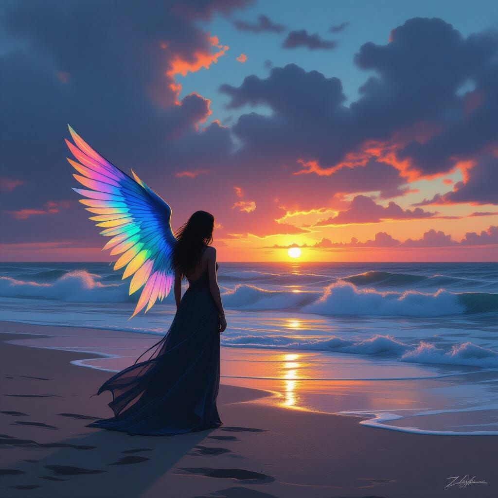 A solitary winged figure stands on a desolate beach at sunset, waves crashing. Moody lighting with deep blues and fiery oranges evokes melancholic beauty. Digital art with surrealist and atmospheric elements.
