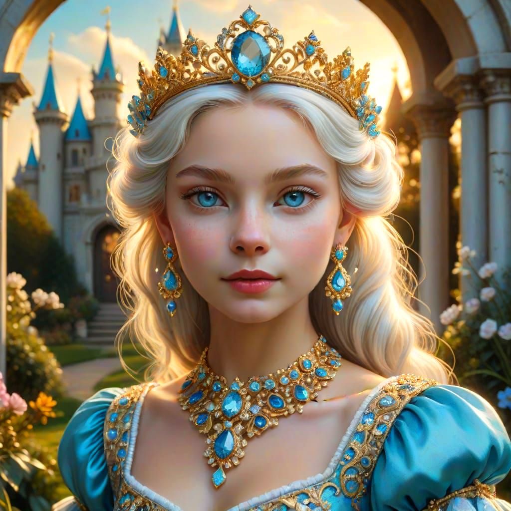 A stunning digital portrait of a princess in a lavish Baroque setting, featuring a white cat in an aqua blue dress, surrounded by luxurious details and precious jewels.