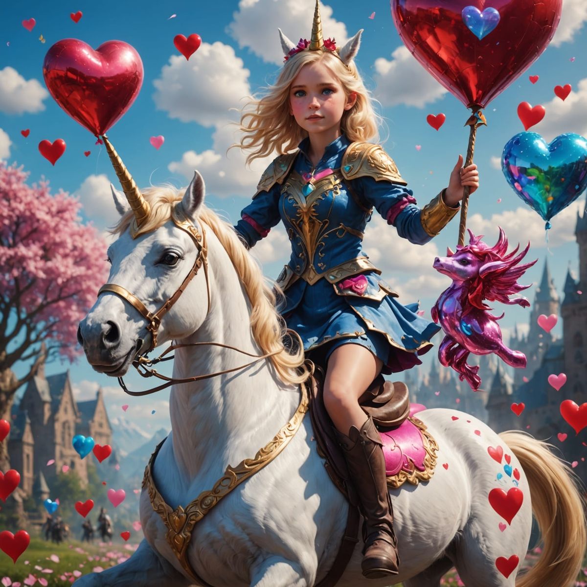 This enchanting image depicts a young girl with blonde hair and blue eyes riding a majestic unicorn, surrounded by a splash of colorful hearts and a Valentine's Day theme. Created in detailed matte painting style with deep colors and intricate detail, this fantasy concept art showcases a magical world of...