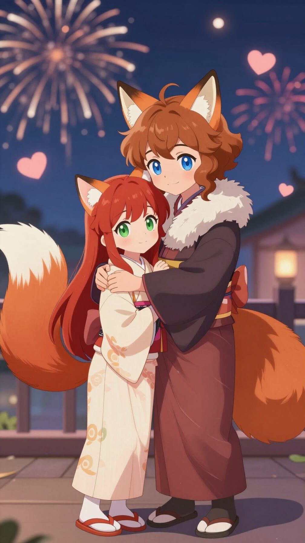 This image shows two cute anime-style women, one with fox features and the other with cat features, sharing an affectionate hug amidst bokeh hearts and fireworks. Kawaii and whimsical.