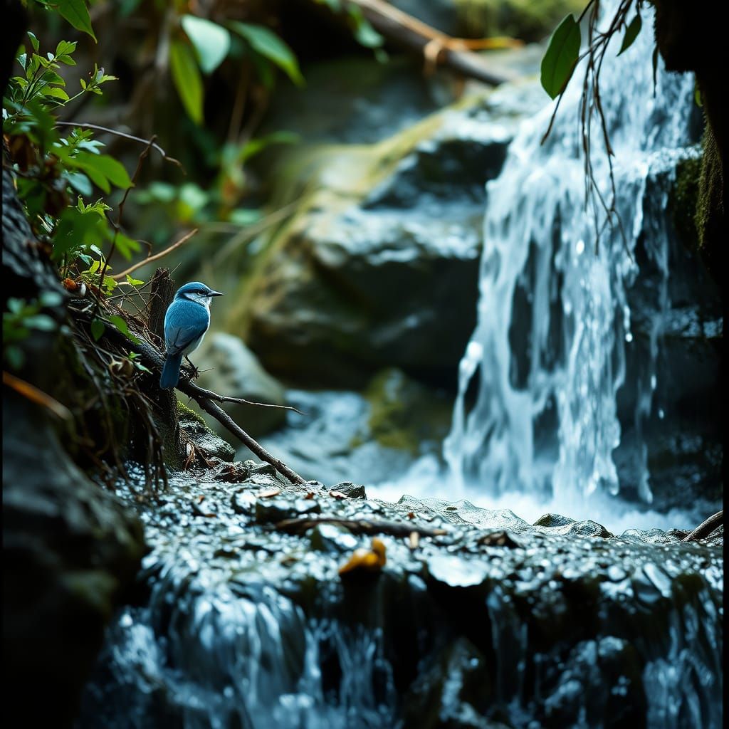 A hyperrealistic image of a small blue bird observing a waterfall from its mountain refuge, surrounded by ferns and lush vegetation. The image evokes a cinematic feel.