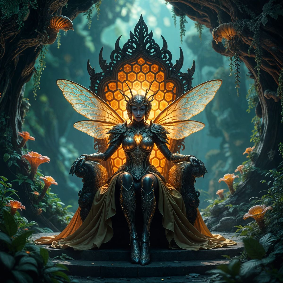 This striking image depicts a queen bee wearing ornate gold and amber armor, seated on a throne of crystallized honeycombs. The scene is enhanced by bioluminescent flora and rendered in a detailed, dark fantasy concept art style with 3D shading.