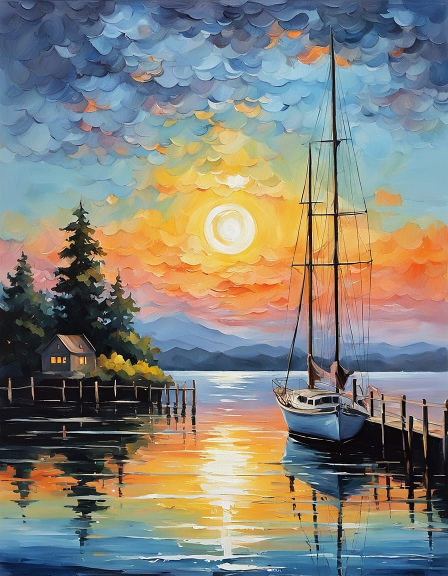 A serene impressionist landscape showing a sailboat on calm water under a full moon. The painting uses soft brushstrokes and complementary colors to create a peaceful and beautiful scene.