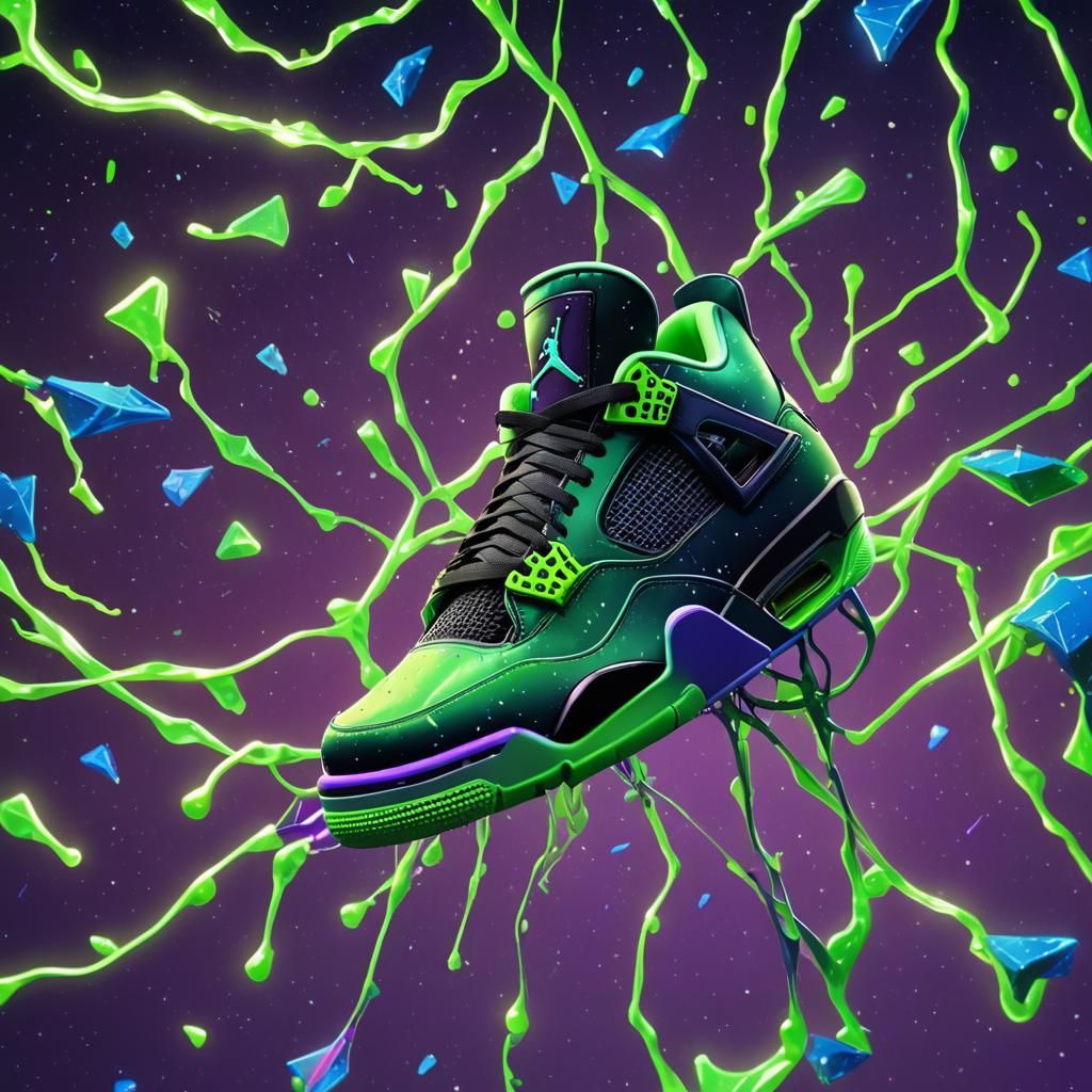 This image shows a low-poly art rendition of a Nike Air Jordan 4 shoe with glowing green slime against a galactic backdrop. This vibrant digital art features a neon glow and intricate textures.