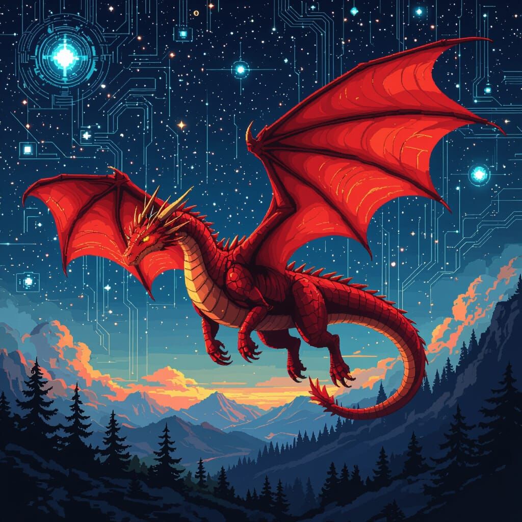 This image features a video game heart with a vibrant red dragon, its wings spread wide, set against a backdrop of stars and circuitry. It evokes a dynamic, pixelated aesthetic with neon lighting.