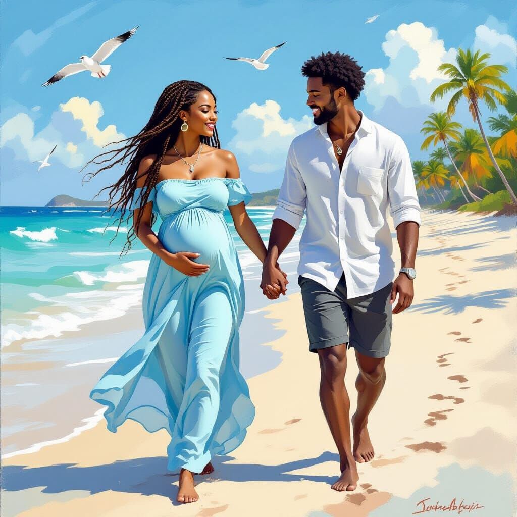 This impressionistic oil painting captures a pregnant woman and her partner walking hand-in-hand on a sun-drenched Brazilian beach during golden hour. Vibrant colors and visible brushstrokes create a warm, serene atmosphere.