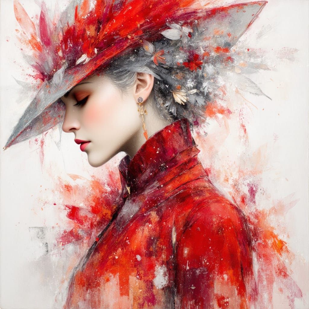 This image shows an elegant princess with an emotional expression. The artwork blends alcohol ink and color pencil sketch techniques, with silver and scarlet hues, reminiscent of old pastel art.