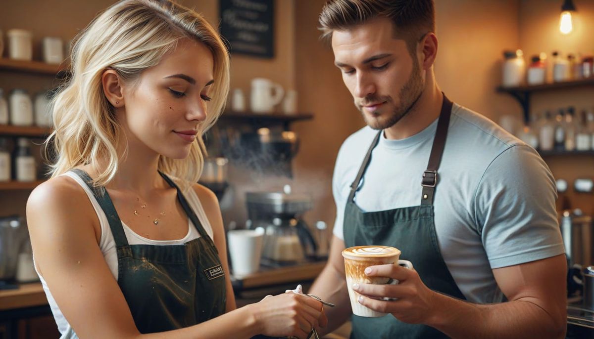 This image shows a blond, brown-eyed barista making a cappuccino. Steam rises from the cup as he smiles warmly. The digital art uses vibrant watercolors with a light and airy pastel color palette.