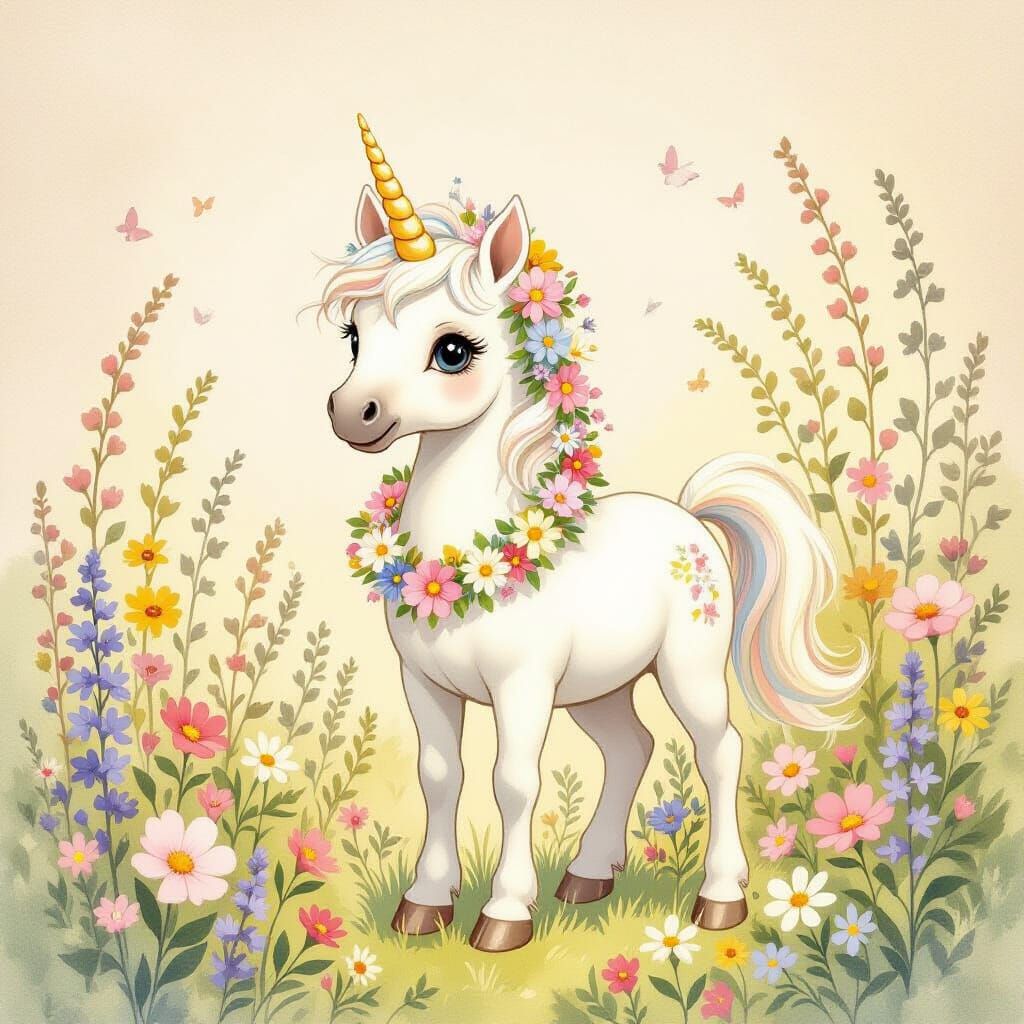 This image shows a small unicorn wearing a flower necklace in a flowery meadow. The artwork is in a delicate watercolor style, using soft pastel colors and intricate details.