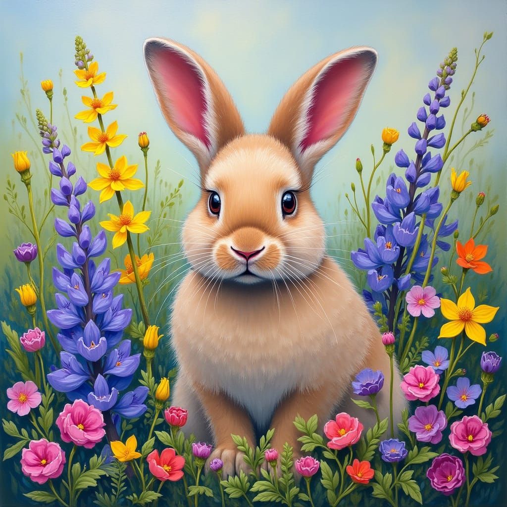 This stunning image depicts a fluffy bunny amidst a lush spring landscape in Iceland, surrounded by vibrant flowers and delicate purple lupines, yellow buttercups, and pink wild roses. The painting's expressive brushstrokes and textured layers evoke the emotional intensity of neo-impressionist expression...