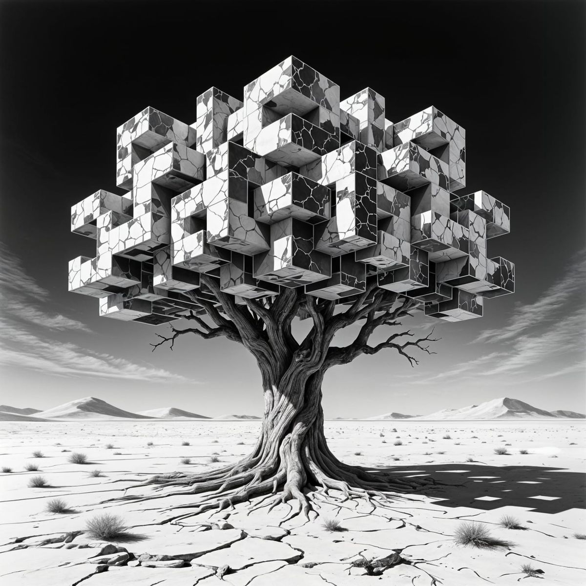 This image depicts a solitary, ancient tree in a wide desert setting. Its form is composed of striking geometric shapes, creating an illusion of impossible patterns in vivid black and white.