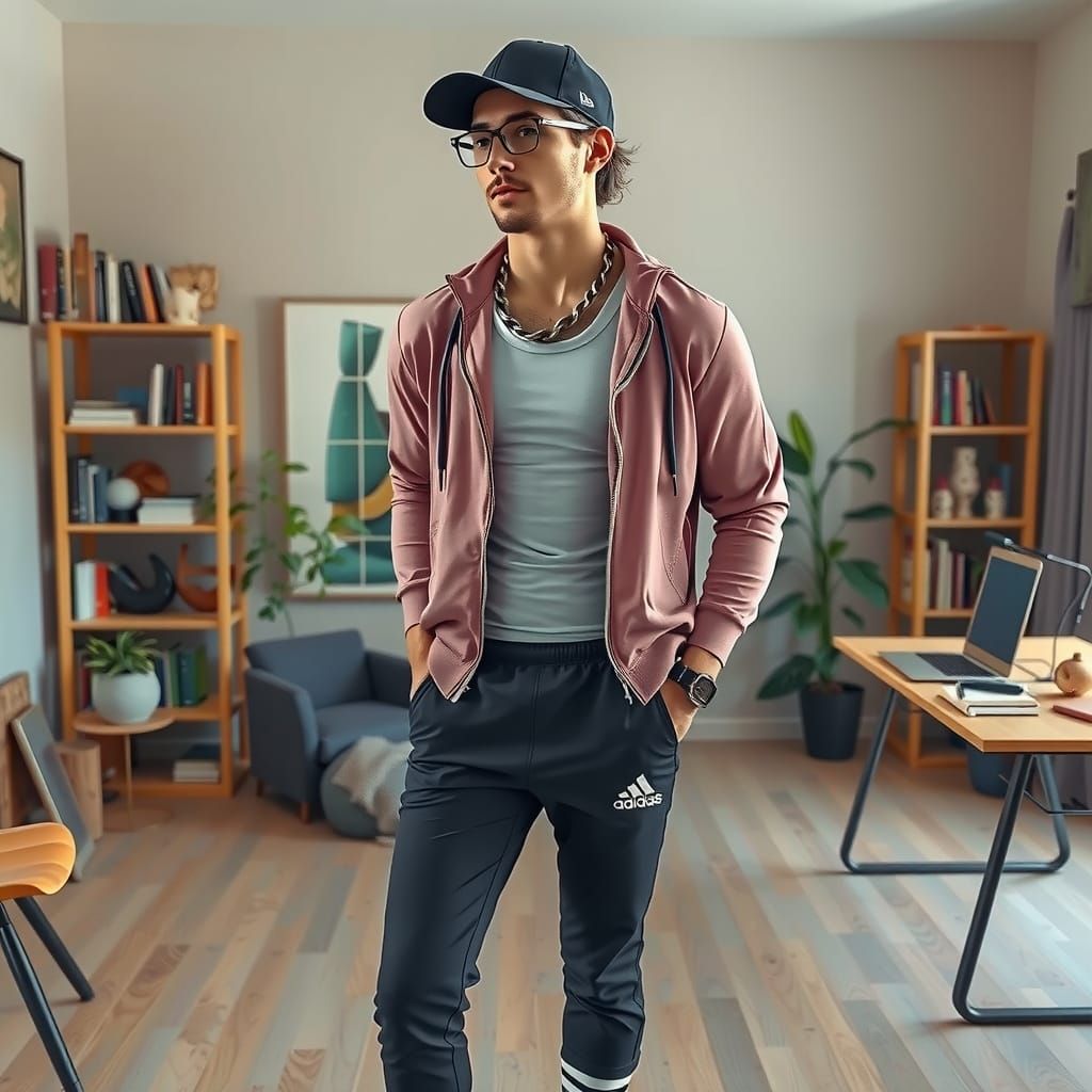This image shows a handsome man in a modern apartment. The photo uses warm lighting to highlight his athletic build. Details include bookshelves, minimalist art, and lush plants.