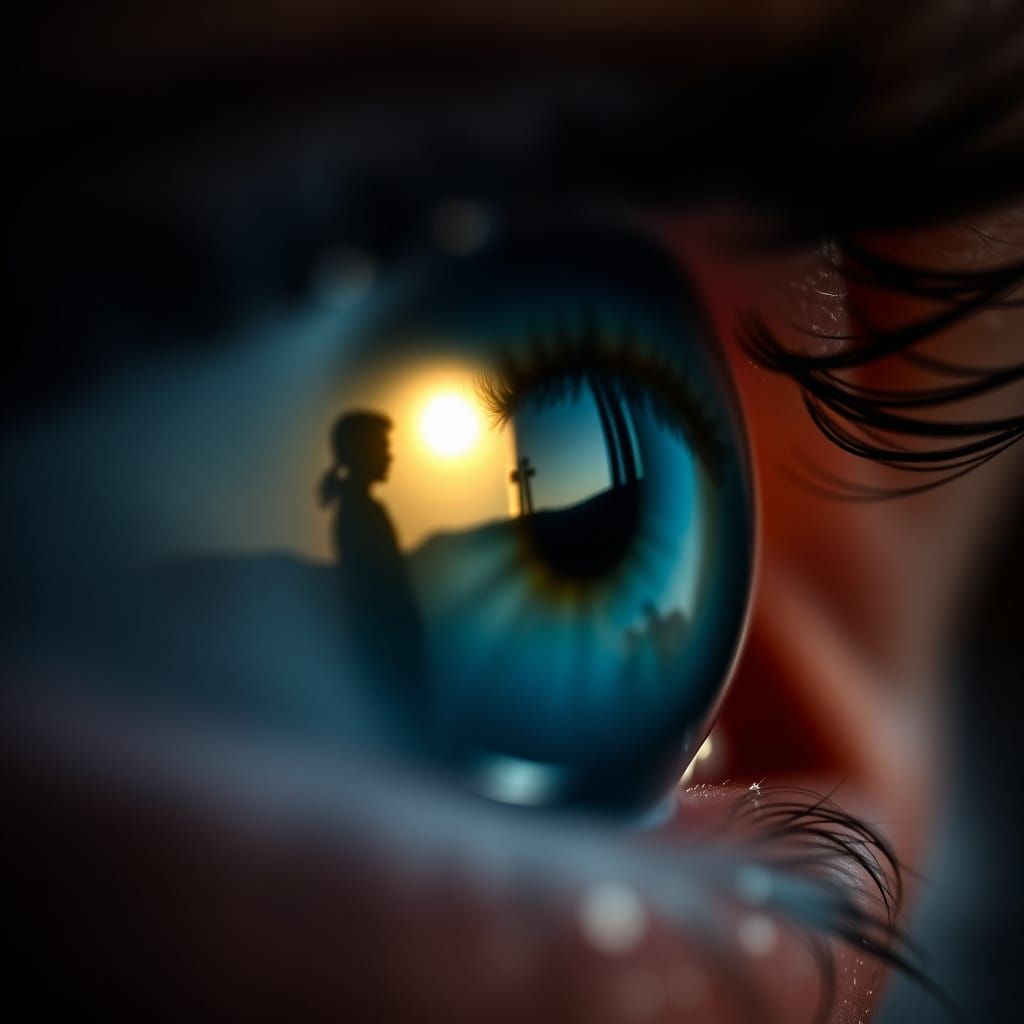 A striking picture of a man's silhouette reflected in a blue eye. The eye conveys longing and sadness, captured with professional photography techniques and a soft, blurred background.