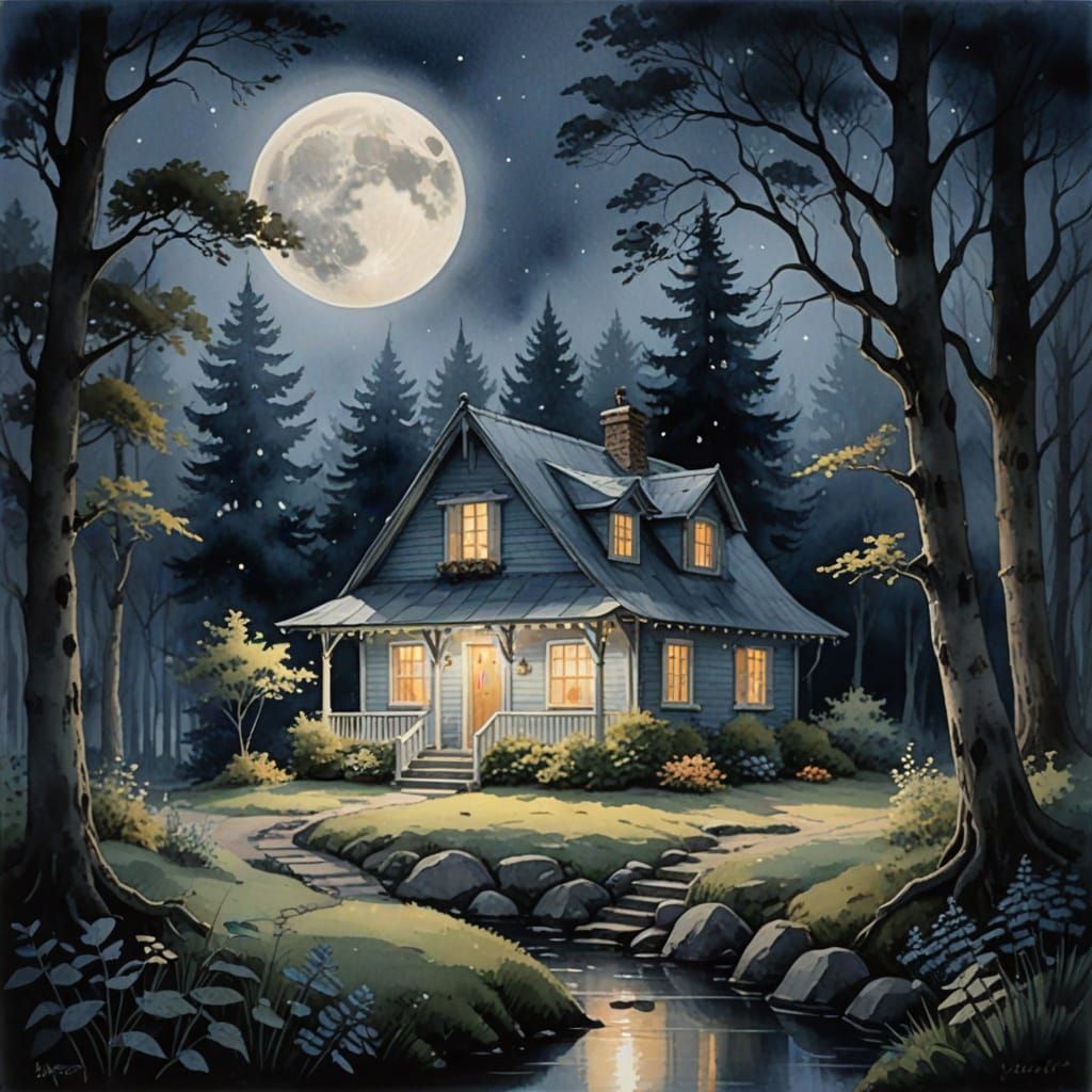 This image shows a cozy cottage glowing with warm light in a dark forest at night, bathed in soft moonlight. Rendered in a romantic watercolor style with ethereal mist.