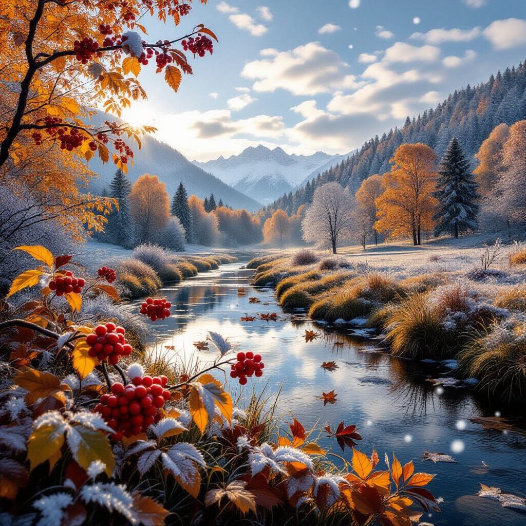 This ultra-realistic 8K photograph depicts the beautiful transition from golden autumn to winter's first touch, featuring frosted leaves, swirling snowflakes, and warm, cool color contrasts.