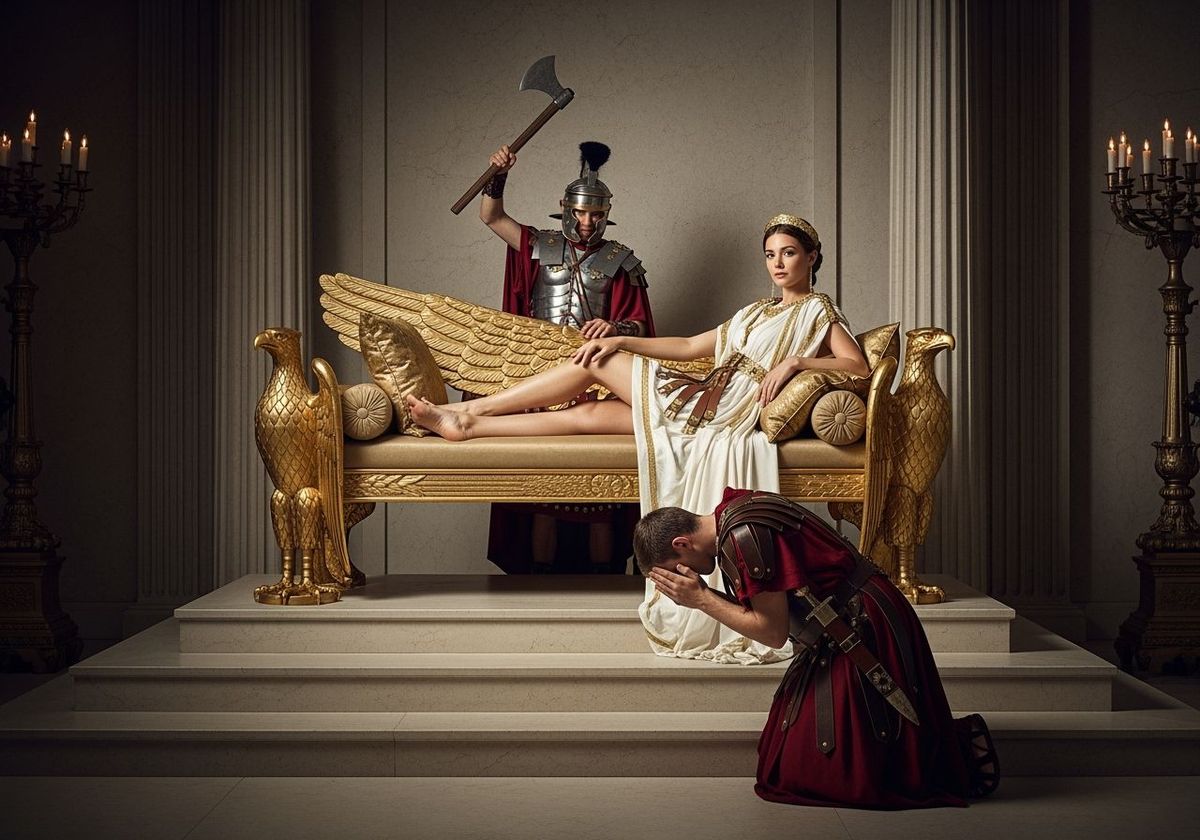This image shows a Roman Empress lounging on an ornate chaise lounge in a throne room. The photograph features a shallow depth of field, bokeh, and natural lighting, in a classical style.