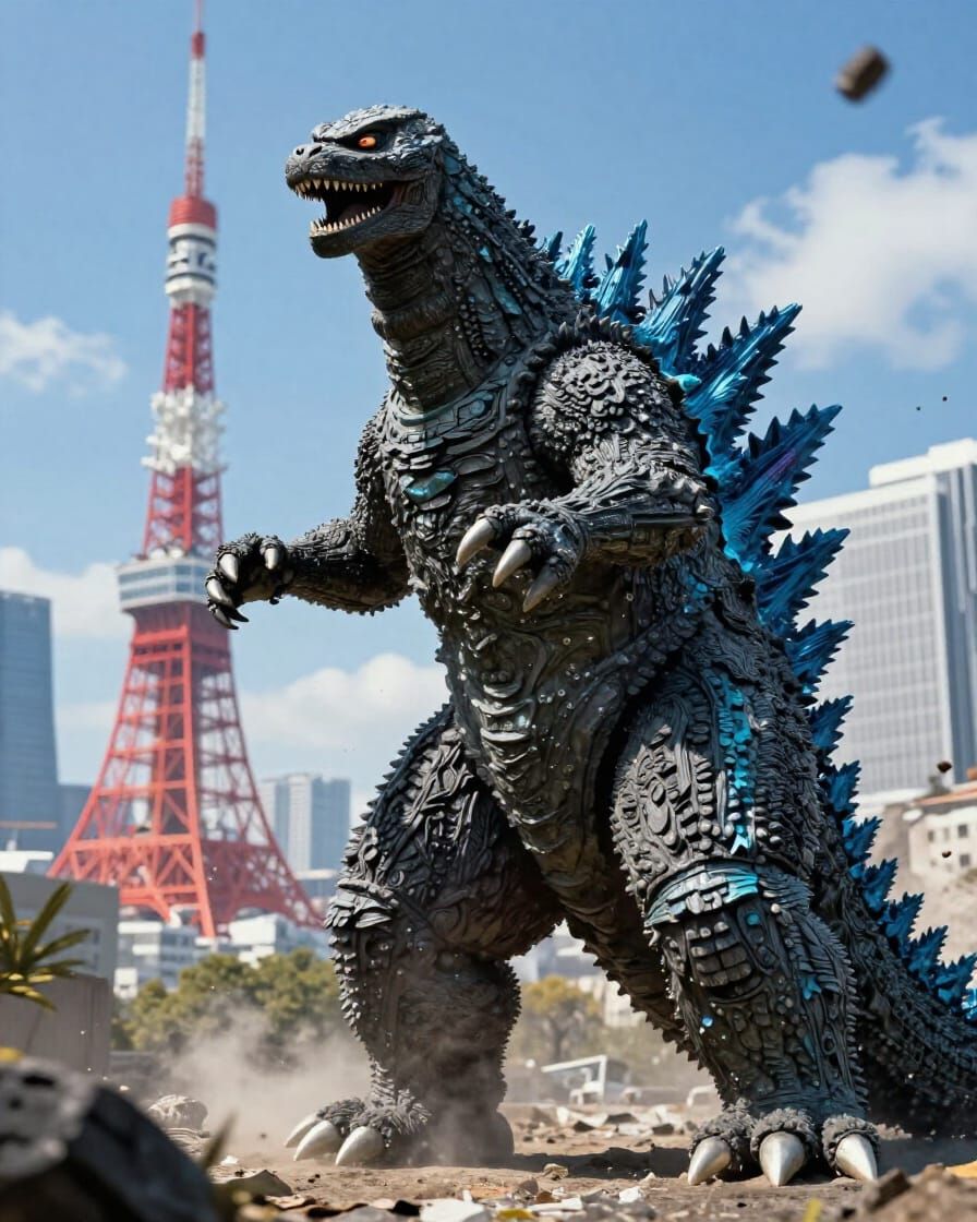This image depicts the iconic Godzilla from 1984 as it rampages through the city of Tokyo, showcasing a destructive cinematic scene.