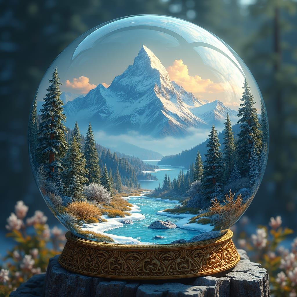 This image shows a miniature, snow-capped mountain and taiga forest within a delicate glass crystal ball, surrounded by rolling hills and icy tundras, with intricate patterns and iridescent colors, reminiscent of surreal, symbolic visions.