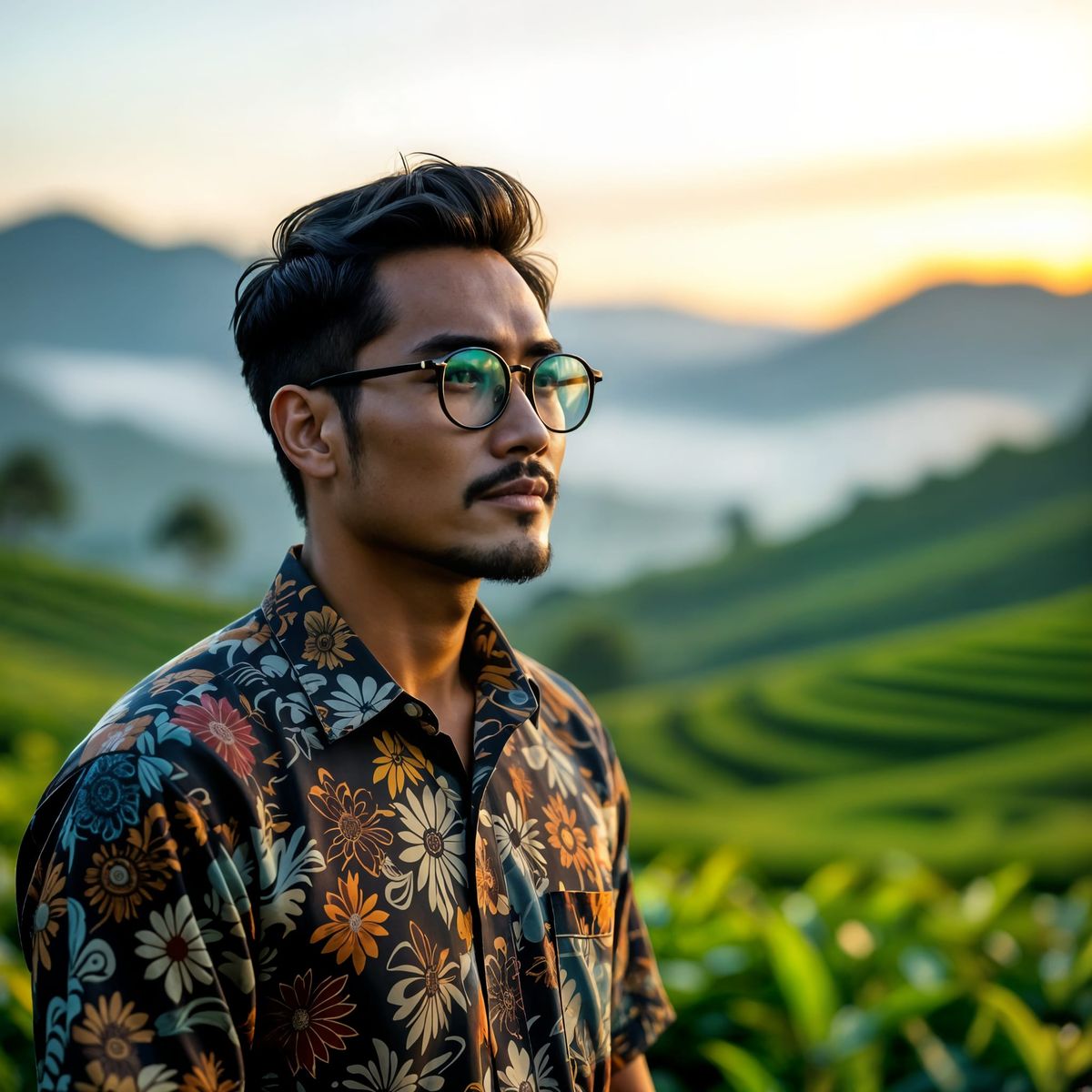This image shows a thoughtful portrait of a man in a batik shirt and round glasses, set in a misty tea plantation at sunrise. The image has a cinematic, photorealistic style with warm colors.