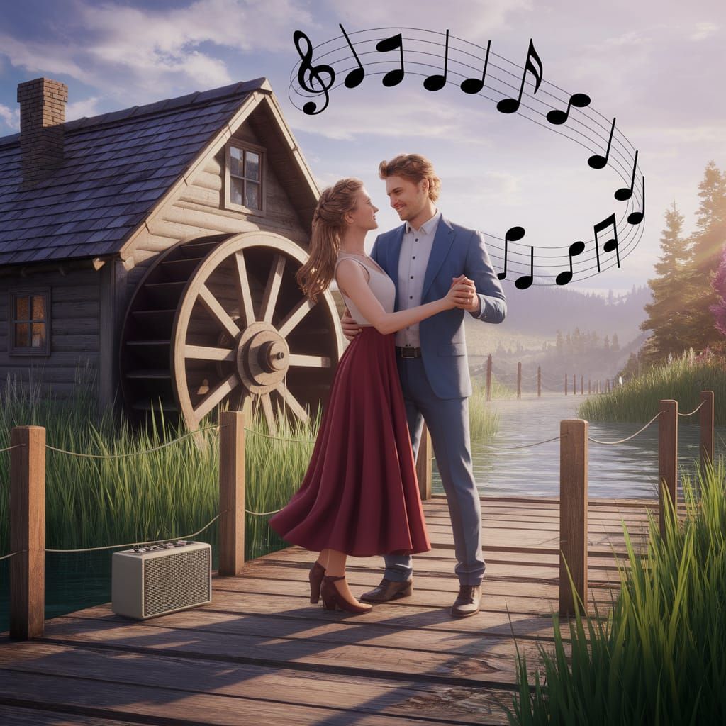 This enchanting image depicts a happy couple dancing on a wooden bridge, surrounded by a serene and idyllic scene with a cozy cabin and a turning water wheel. Vibrant colors and intricate details bring this fantasy world to life.