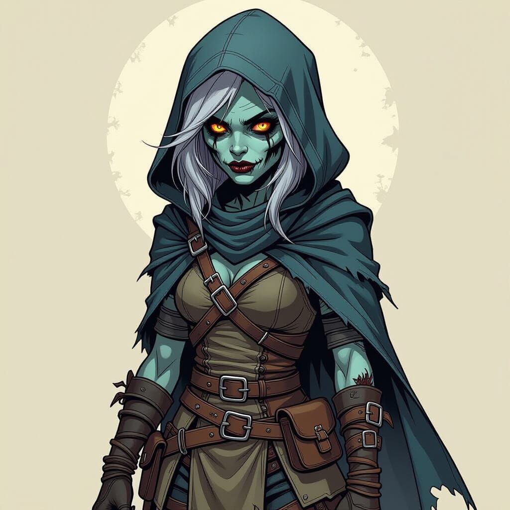 This image shows a female halfling zombie in rogue attire, rendered in an illustrative old-school D&D style. The artwork features bold lines and vibrant colors.