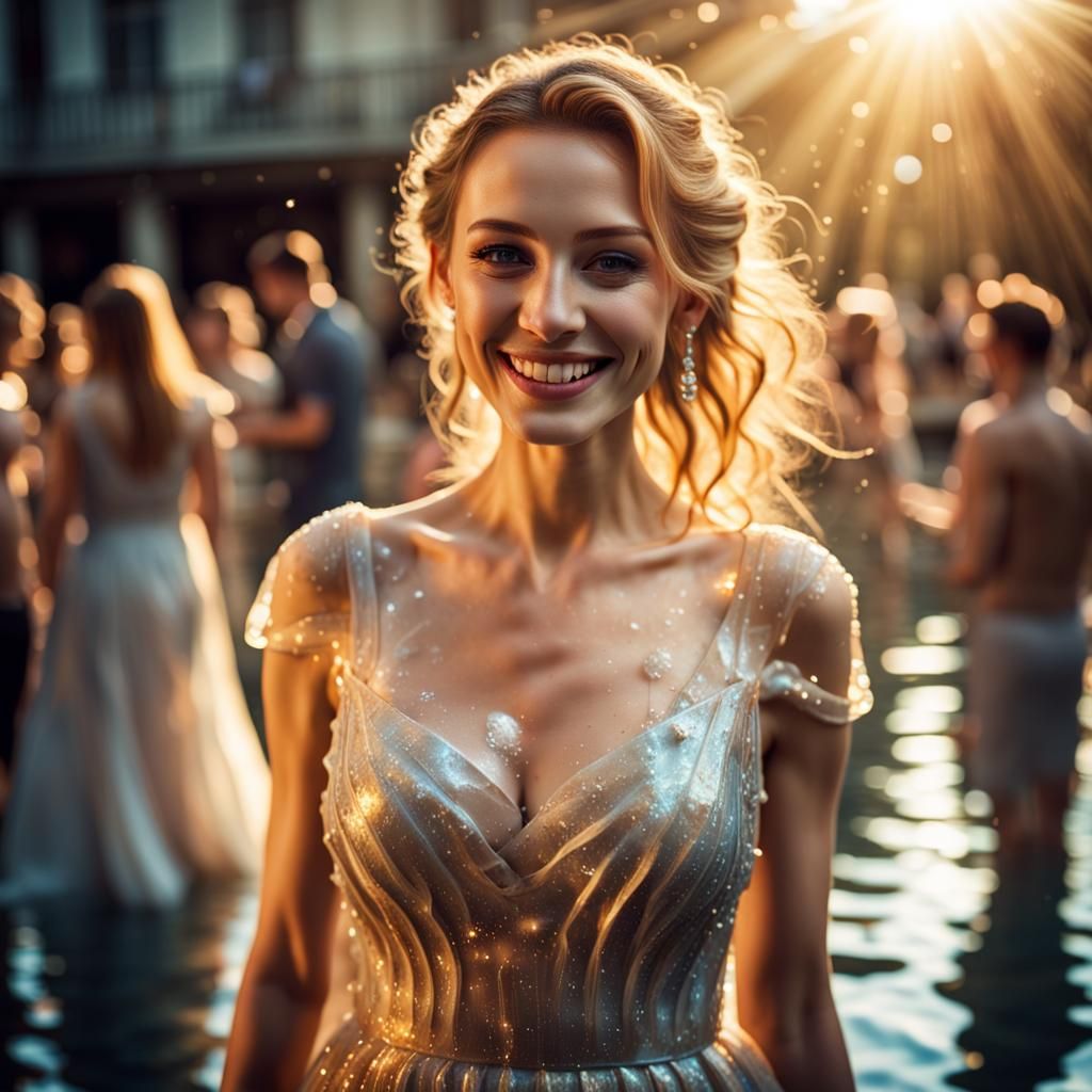 This image shows a beautiful woman smiling at a party, wearing a dress made of sunlight and water. This hyperrealistic digital artwork is rich with intricate details and cinematic lighting.