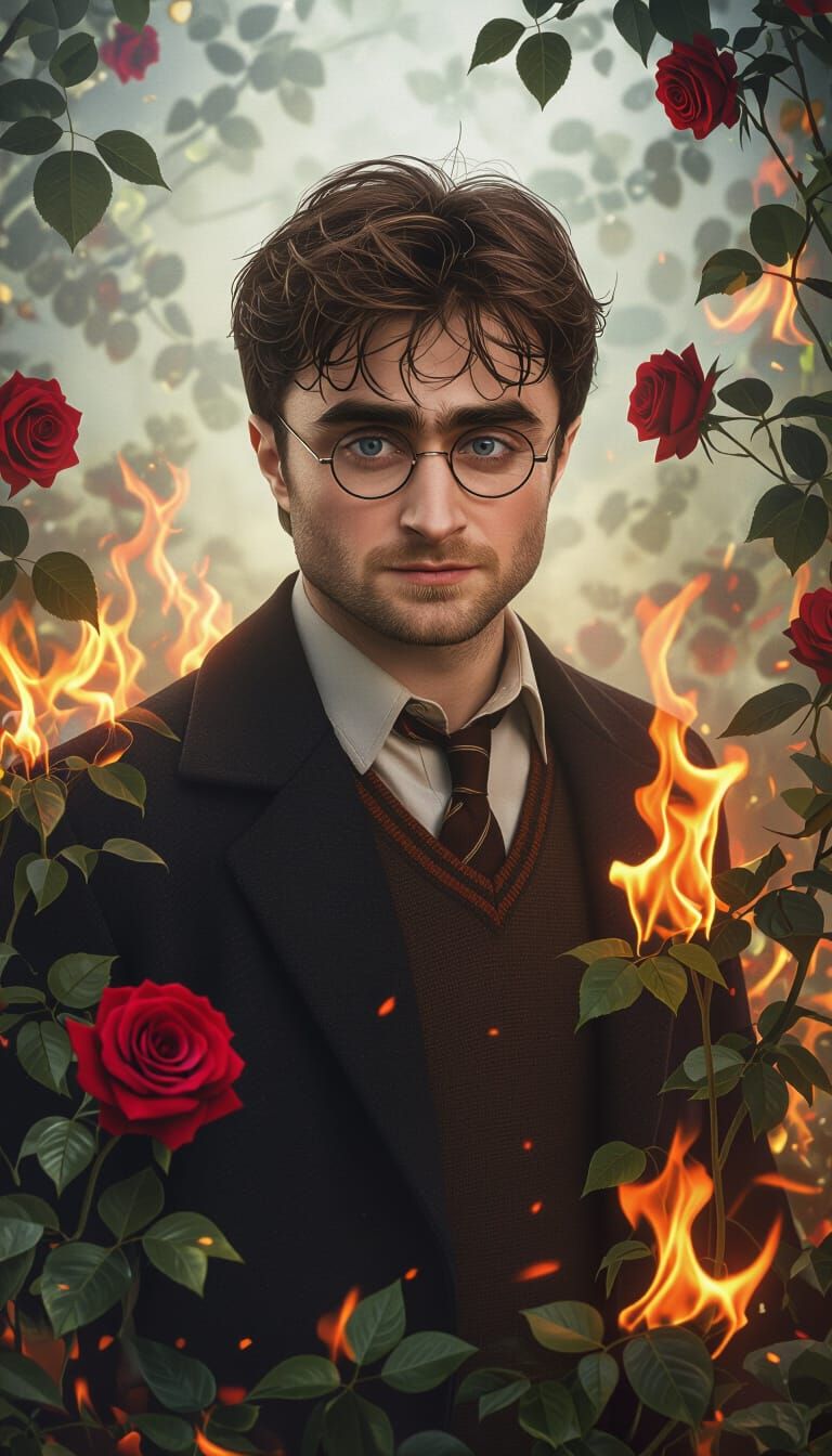 This image showcases a figure encircled by fiery ivy and roses, set within an enchanting fantasy backdrop. The artwork features detailed mist effects and dynamic lighting, reminiscent of a 3D game cinematic, enhanced with vibrant colors.