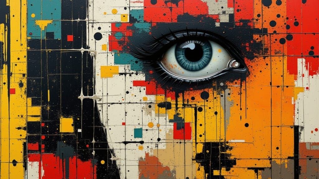 A medium shot of a fragmented Varga Woman featuring circuitry and digital decay. This abstract piece uses vibrant colors, glitching elements, and mixed media textures.