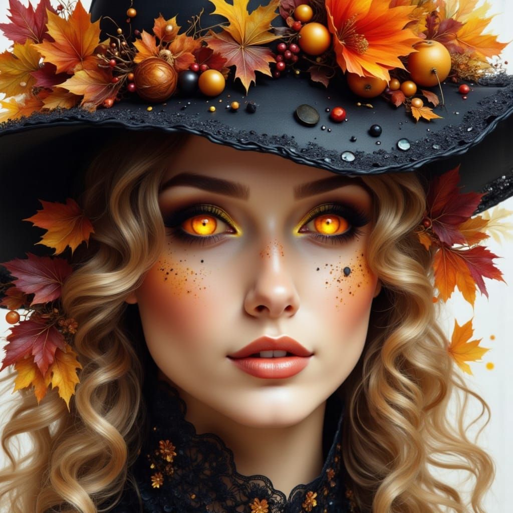 This image features a detailed close-up of a figure in an autumn witch outfit and hat, set against a soft watercolor background.