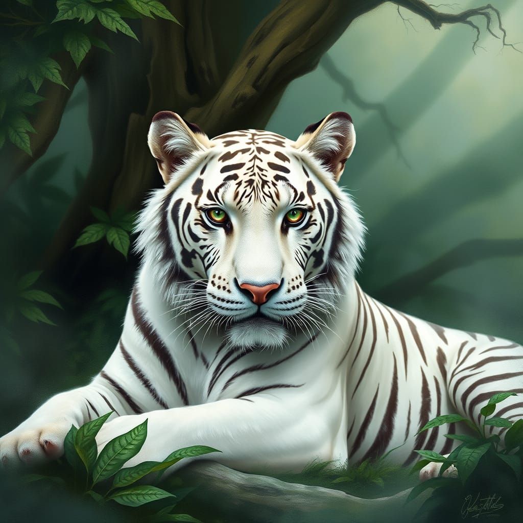 This image depicts a majestic white tiger in a serene jungle setting, surrounded by lush foliage and ancient trees, with piercing emerald eyes and a mesmerizing coat of creamy whites and subtle grays, reminiscent of realistic wildlife art and dreamlike landscapes.