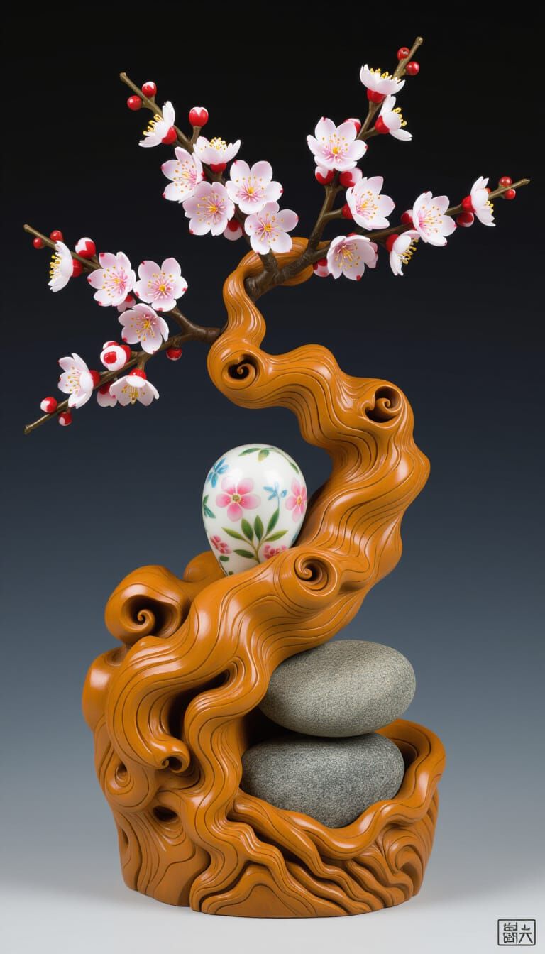 This intricate wooden figurine features gnarled roots gripping stone at its base, transitioning into delicate porcelain cherry blossoms at its top. A striking contrast of rough and smooth textures symbolizes growth.