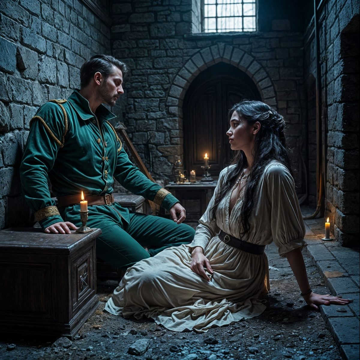 A dimly lit prison cell with a small window casting an eerie glow, featuring a mysterious figure with a cat-like mustache and a woman with raven hair, set in a cold, grey stone environment with intricate details.