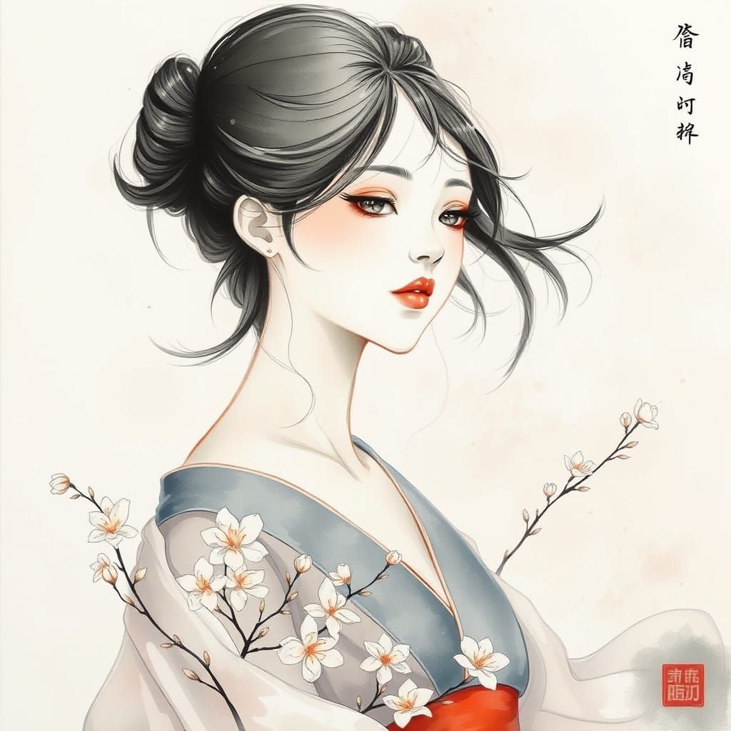graceful woman in a flowing dress adorned with delicate flowers. Her hair is elegantly styled, and her expression is serene, with a soft color palette that exudes tranquility. Traditional Japanese ink wash painting, elegant, fantasy, beautiful, dreamy, soft colors