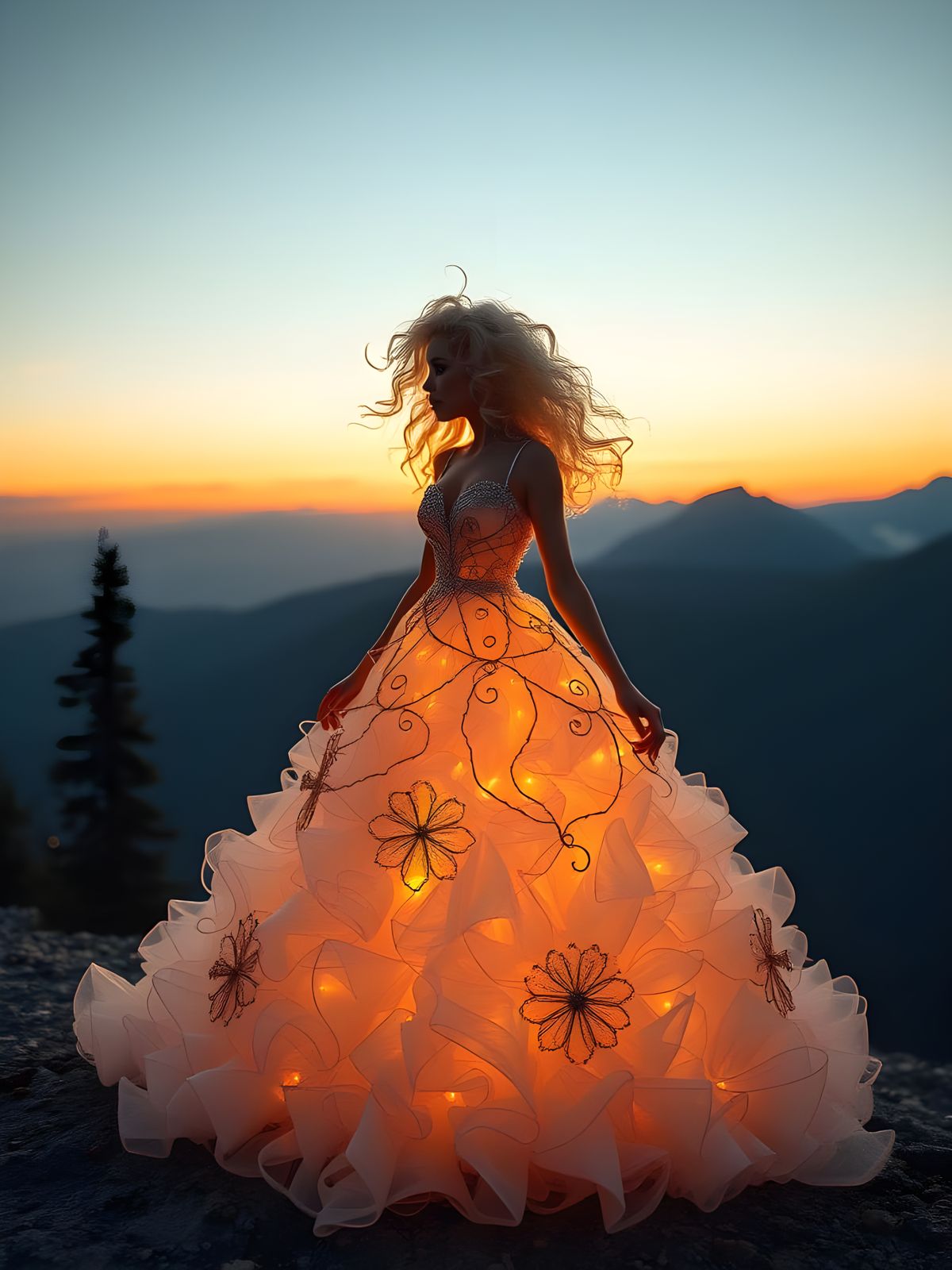 A striking picture of a curly-haired albino woman wearing a resin wire art ball gown against a backdrop of a mountain sunrise. The image is reminiscent of digital art.