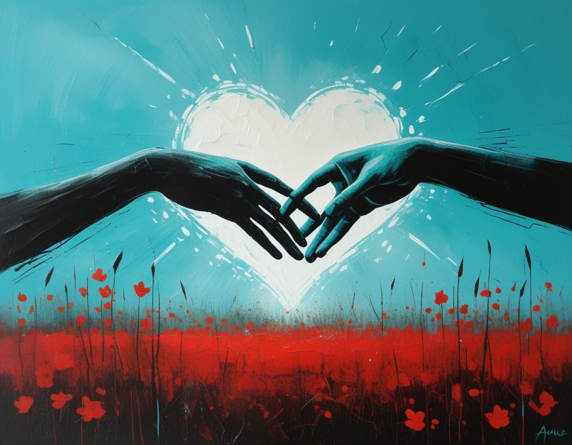 This oil painting features two glowing silhouettes in a misty field, with aqua light from their hands and red energy trails. The art style uses thick paint, textured strokes, and a cracked patina for a bold, vibrant look.