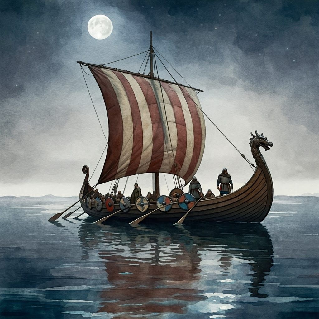 A watercolor captures a Viking longship sailing serenely under the moon. Crew members are cloaked and shielded on the wooden vessel. Cool blues and silvers create a timeless, naturalistic scene.